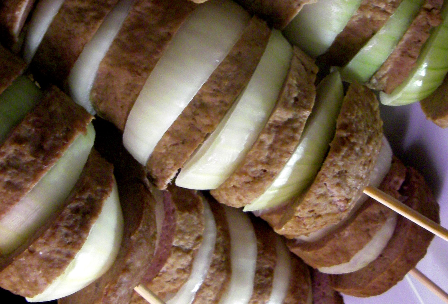 Wat heb je nodig? (3 stuks) Voor de spies: 500 gram rundergehakt. peper en zout. 2 grote uien. Voor de satésaus: 150 gram pindakaas. 2 eetlepels mirin. 2 ½ eetlepel sojasaus. 2 theelepels honing. ½ theelepel knoflookpoeder. 80 milliliter kokend water. 1. Breng het gehakt op smaak met peper en zout en kneed drie grote ballen van het gehakt.